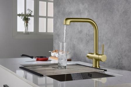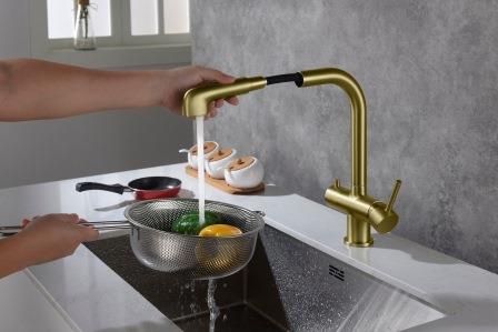 Смеситель для кухни с фильтр. и вытяжн. лейкой боковой двухрычажный Saona (золотой матовый), Ø 35, и