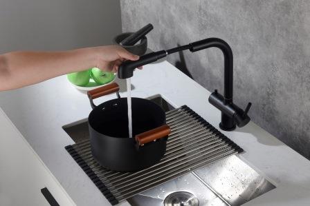 Смеситель Timo Saona 2346 с выдвижной лейкой и системой подключения фильтрованной воды относится к премиальному сегменту, предназначен для монтажа на кухонную мойку или столешницу. Высокий излив подходит для моек с двумя чашами, а также позволяет справляться с мытьем габаритной посуды. Выдвижная лейка с прочным шлангом облегчает мытье раковины, крупной посуды, позволяет набрать воду в емкость, стоящую рядом с мойкой. Встроенный магнитный держать позволяет легко вернуть лейку в исходное положение. В нижней части смесителя установлена трубка с адаптером для соединения с трубкой фильтра. Подача фильтрованной воды осуществляется поворотом ручки дивертора расположенной слева на корпусе смесителя.