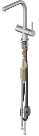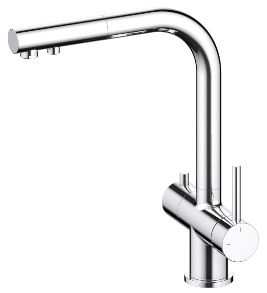 Высокий излив подходит для моек с двумя чашами, а также позволяет справляться с мытьем габаритной посуды. Для подачи горячей воды необходимо повернуть рычаг на себя. Выдвижная лейка с прочным шлангом облегчает мытье раковины, крупной посуды, позволяет набрать воду в ёмкость, стоящую рядом с мойкой. Встроенный магнитный держать позволяет легко вернуть лейку в исходное положение. В нижней части смесителя установлена трубка с адаптером для соединения с трубкой фильтра. Подача фильтрованной воды осуществляется поворотом ручки дивертора расположенной слева на корпусе смесителя.