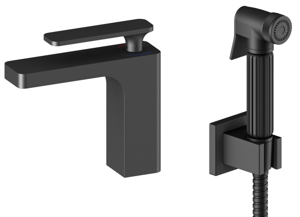 Смеситель для раковины с гигиен. душем однорычажный Torne (чёрный), Ø 35, излив плоский 125 мм, гайк