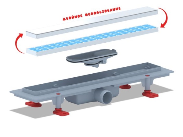 Имеет вытянутую прямоугольную форму, его также называют дренажным каналом или душевым лотком. Сверху трап закрывает прямоугольная гладкая матовая решетка (нержавеющая сталь), которая задерживает мусор, препятствуя забиванию слива, а также выполняет декоративную функцию. На решетку можно становиться, принимая душ: изделие выдерживает нагрузку до 300 кг.