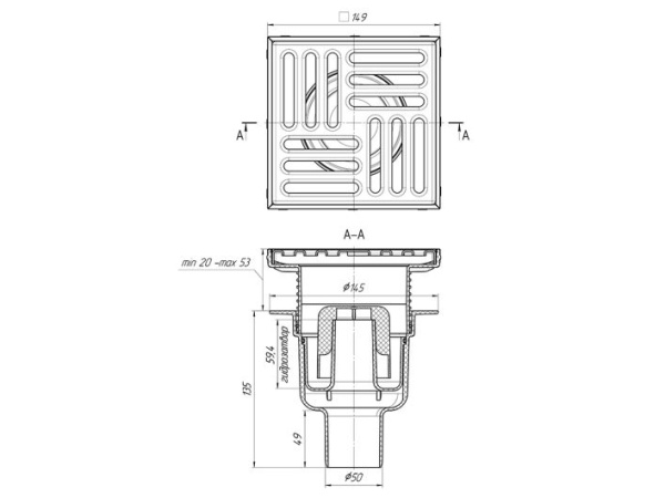 Трап вертикальный, регулируемый с выпуском 50 мм, с нержавеющей решеткой 15x15