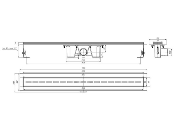 Трап линейный металл 850 х 65 мм, матовая решётка "Киль", гидрозатвор, выпуск 50 мм