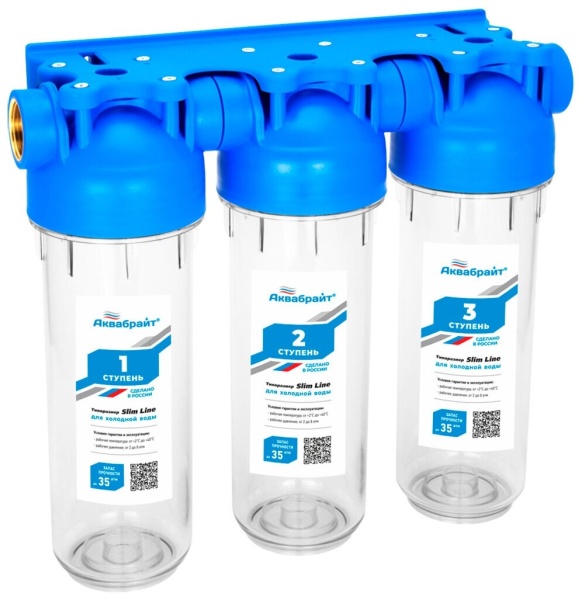 АБФ-3 1, Трехступенчатый магистральный фильтр АКВАБРАЙТ стандарт SLIM LINE. Прозрачные корпуса. Рабочее давление от 2 до 6 атм. Подключение ЛАТУННАЯ ВСТАВКА 1 дюйм. Кронштейн и ключ в комплекте. Фильтр устанавливается в водопроводную магистраль и предназначен для очистки ХОЛОДНОЙ воды.Эффективно задерживает различные примеси в зависимости от установленного картриджа. Установка регулятора давления