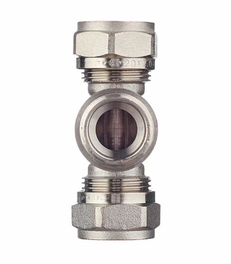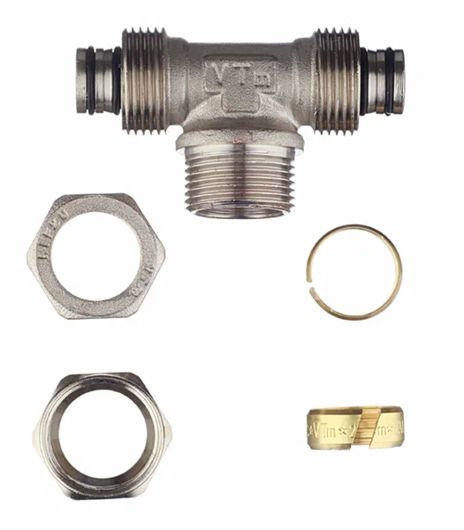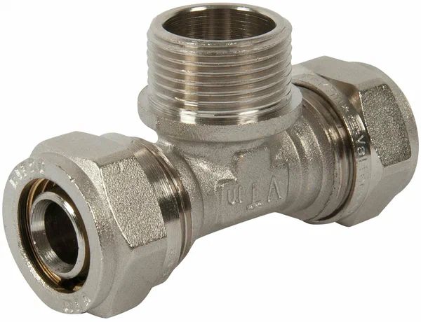 Этот трехсторонний латунный никелированный фитинг предназначен для соединения с металлопластиковым трубопроводом компонентов, которые подключаются через резьбу. Фитинг имеет наружную трубную резьбу, соответствующую ГОСТ 6357.