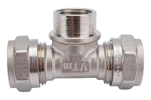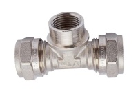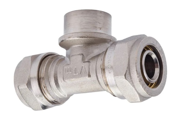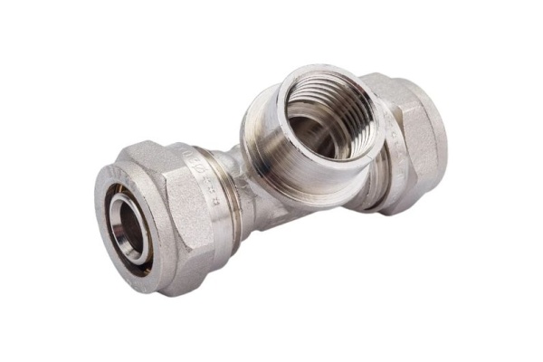Трехсторонний латунный никелированный фитинг для подсоединения к металлопластиковому трубопроводу компонента с резьбовым подключением. Резьба фитинга – внутренняя трубная по ГОСТу 6357.