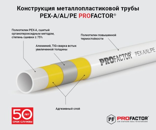 Применение в производстве металлопластиковых труб PROFACTOR® сшитого полиэтилена PEX-A, обладающего степенью сшивки более 75% и алюминиевого слоя повышенной толщины, соединенного методом TIG-сварки, определяет высокое качество этих труб, гарантирующее их надёжность и длительный срок эксплуатации.