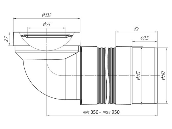 Удлинитель гибкий для унитаза выход в канализацию 110 мм угол 90°, длина 350-950 мм