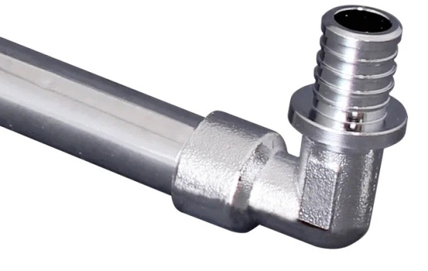 Угольник Г-образный, аксиальный из хромированной латуни, предназначен для присоединения радиаторов с нижним подключением к трубопроводу (PEX или PERT) при скрытой прокладке.