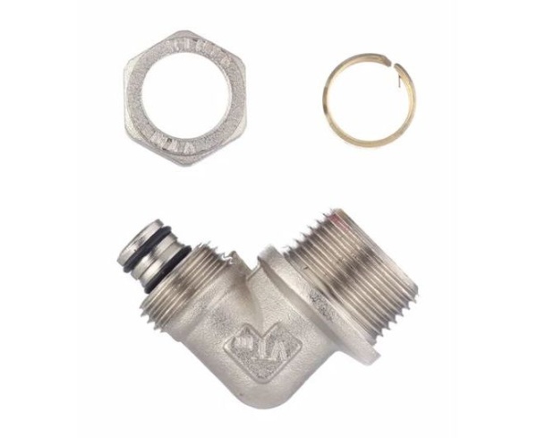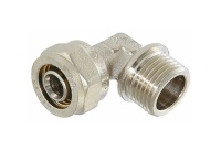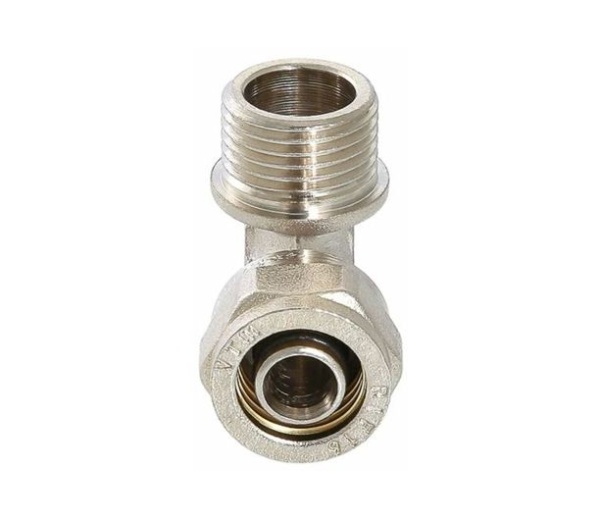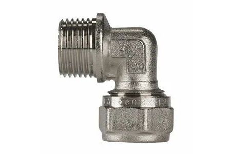 Угловой латунный никелированный обжимной фитинг предназначен для соединения металлополимерного трубопровода с элементами системы, подключаемыми с помощью резьбы. Он оснащён наружной трубной резьбой, соответствующей требованиям ГОСТ 6357.