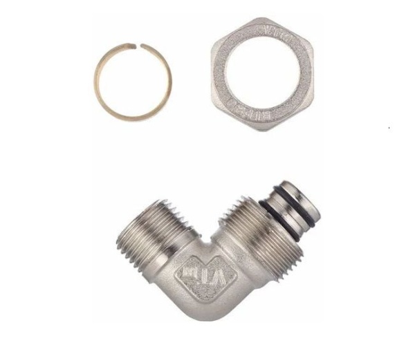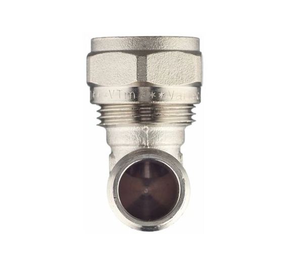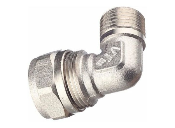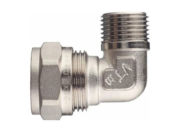 Угловой латунный никелированный обжимной фитинг предназначен для соединения металлополимерного трубопровода с элементами системы, подключаемыми с помощью резьбы. Он оснащён наружной трубной резьбой, соответствующей требованиям ГОСТ 6357.