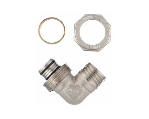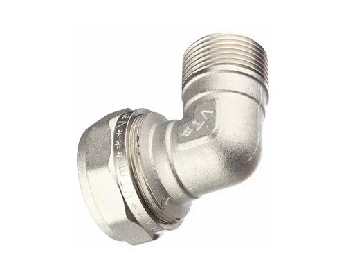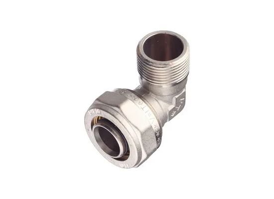 Угловой латунный никелированный обжимной фитинг предназначен для соединения металлополимерного трубопровода с элементами системы, подключаемыми с помощью резьбы. Он оснащён наружной трубной резьбой, соответствующей требованиям ГОСТ 6357.