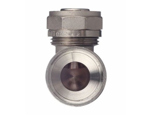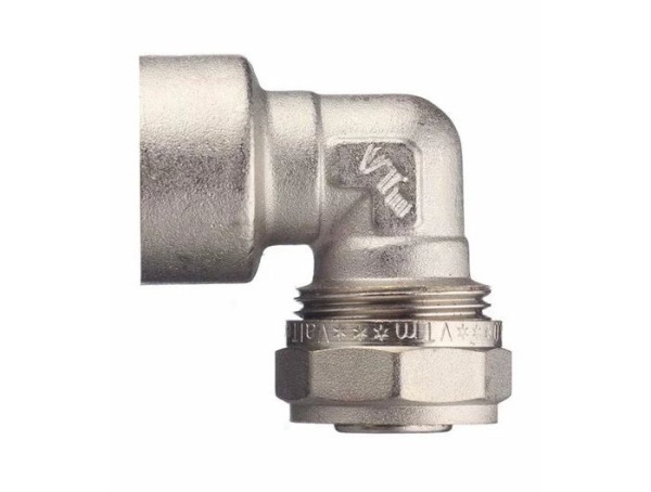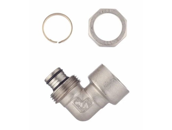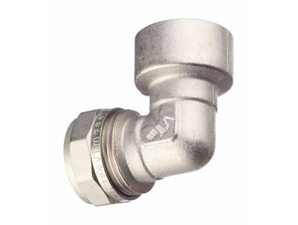 Угловой латунный никелированный обжимной фитинг предназначен для соединения металлополимерного трубопровода с элементами системы, подключаемыми с помощью резьбы. Он оснащён внутренней трубной резьбой, соответствующей требованиям ГОСТ 6357.