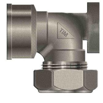 Угловой латунный никелированный фитинг с креплением (водорозетка) для соединения металлополимерного трубопровода с компонентом системы, имеющим резьбовое подключение. Резьба фитинга – внутренняя трубная по ГОСТу 6357.