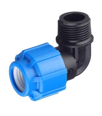 Уголок ПНД обжимной с наружной резьбой аналогичен по внешнему виду и назначению угольнику обжимному обычному, однако имеет внешнюю нарезанную резьбу, что позволяет монтировать соединение комбинированного типа.