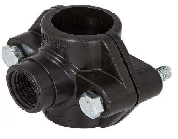 Пластины крепятся между собой четырьмя болтами с шайбами и гайками. Устроена такая врезка по принципу бандажа. Между трубой и пластиной с отводом устанавливается уплотнительная резинка, после чего болтами стягиваются обе пластины, а заключительным этапом является сверления трубы через водоотвод для того, чтобы открыть доступ воды в отвод. Соответственно, от отвода прокладывается отдельная магистраль.