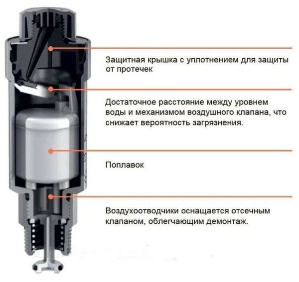Воздухоотводчики применяются как в фазе наполнения системы водой, так и в фазе опорожнения. Их не следует путать с дегазаторами, хотя у них общая поплавковая система внутри. Камера постоянного давления этого устройства ограничена, что ограничивает функцию «дегазации», поэтому рекомендуется наличие отсекающего клапана.